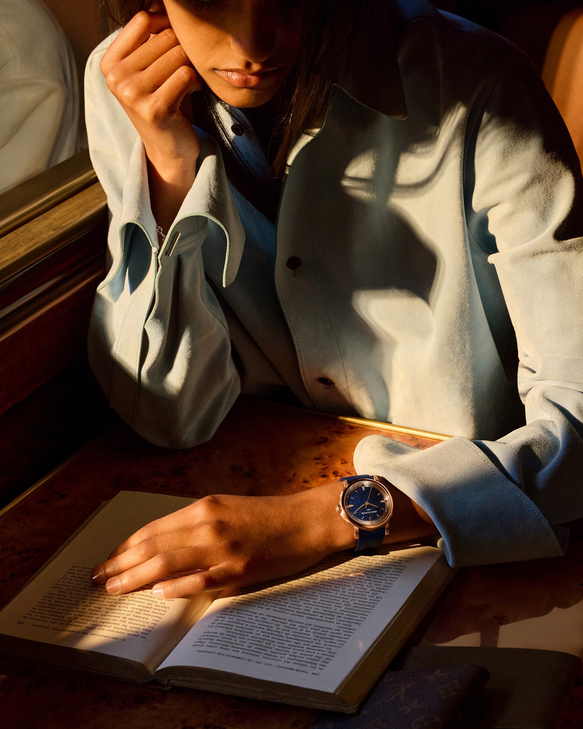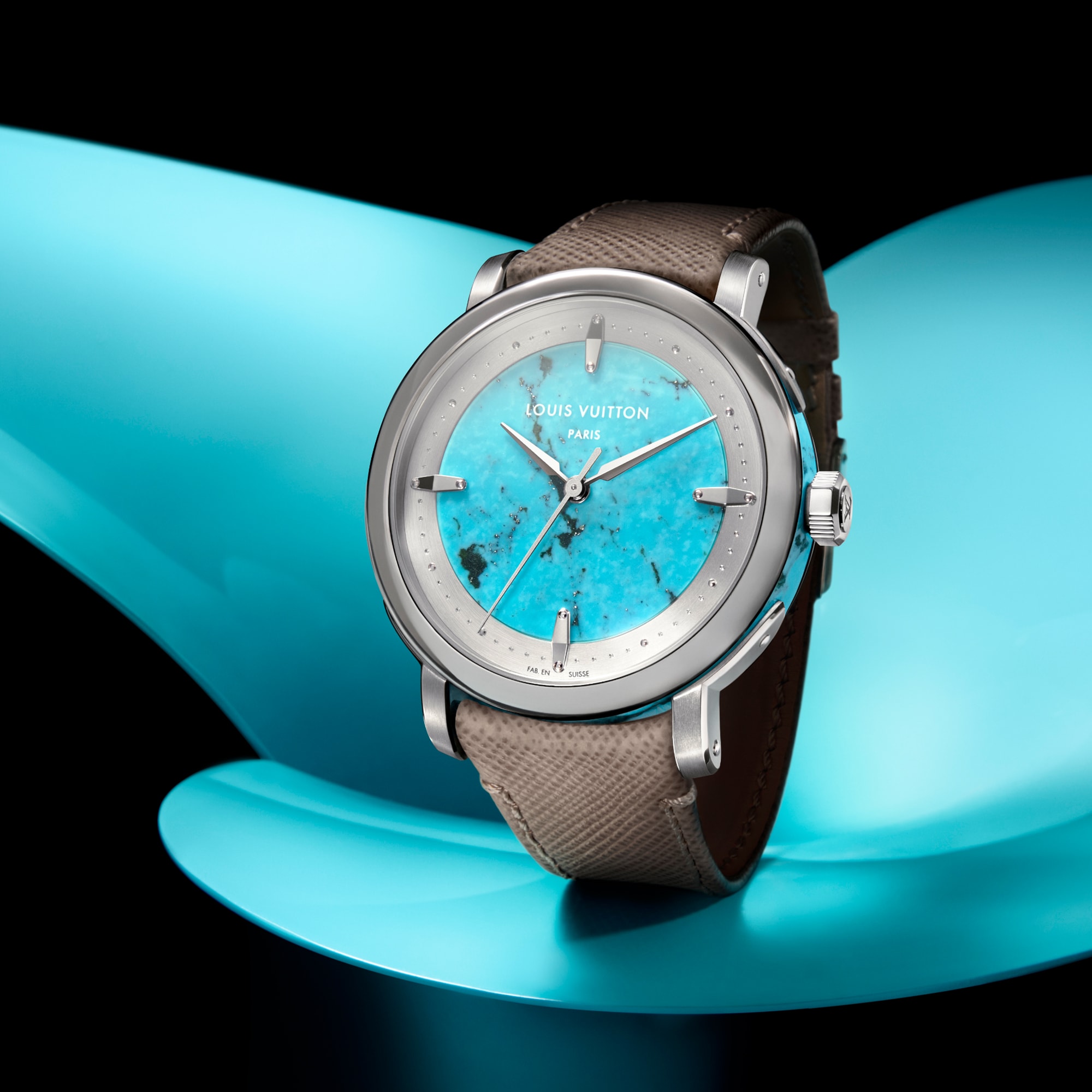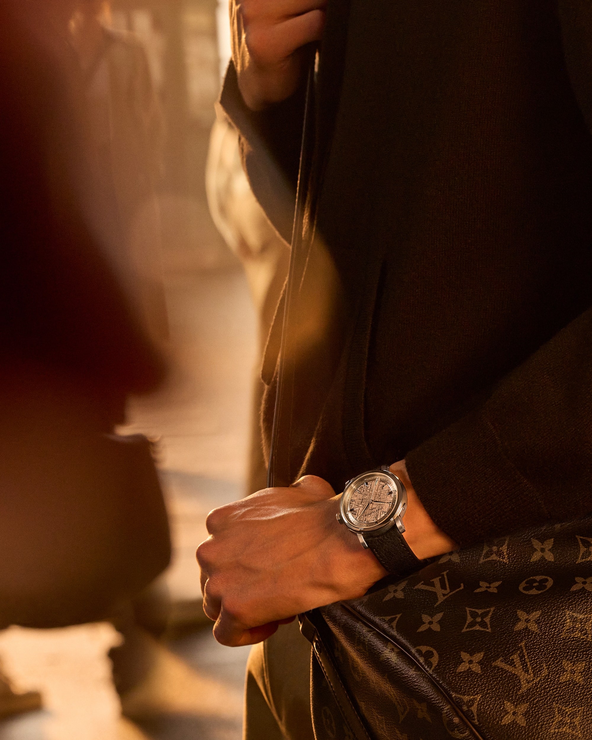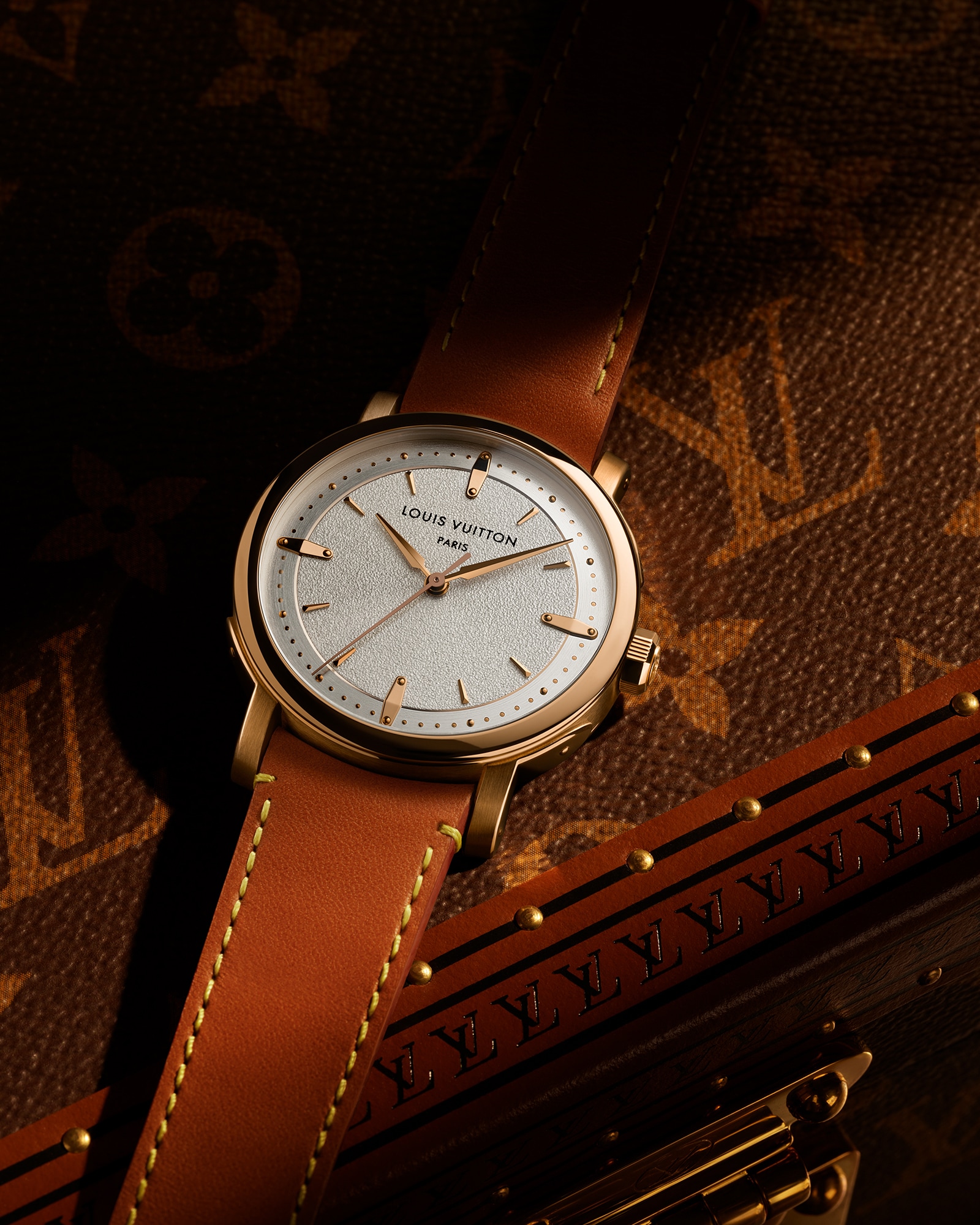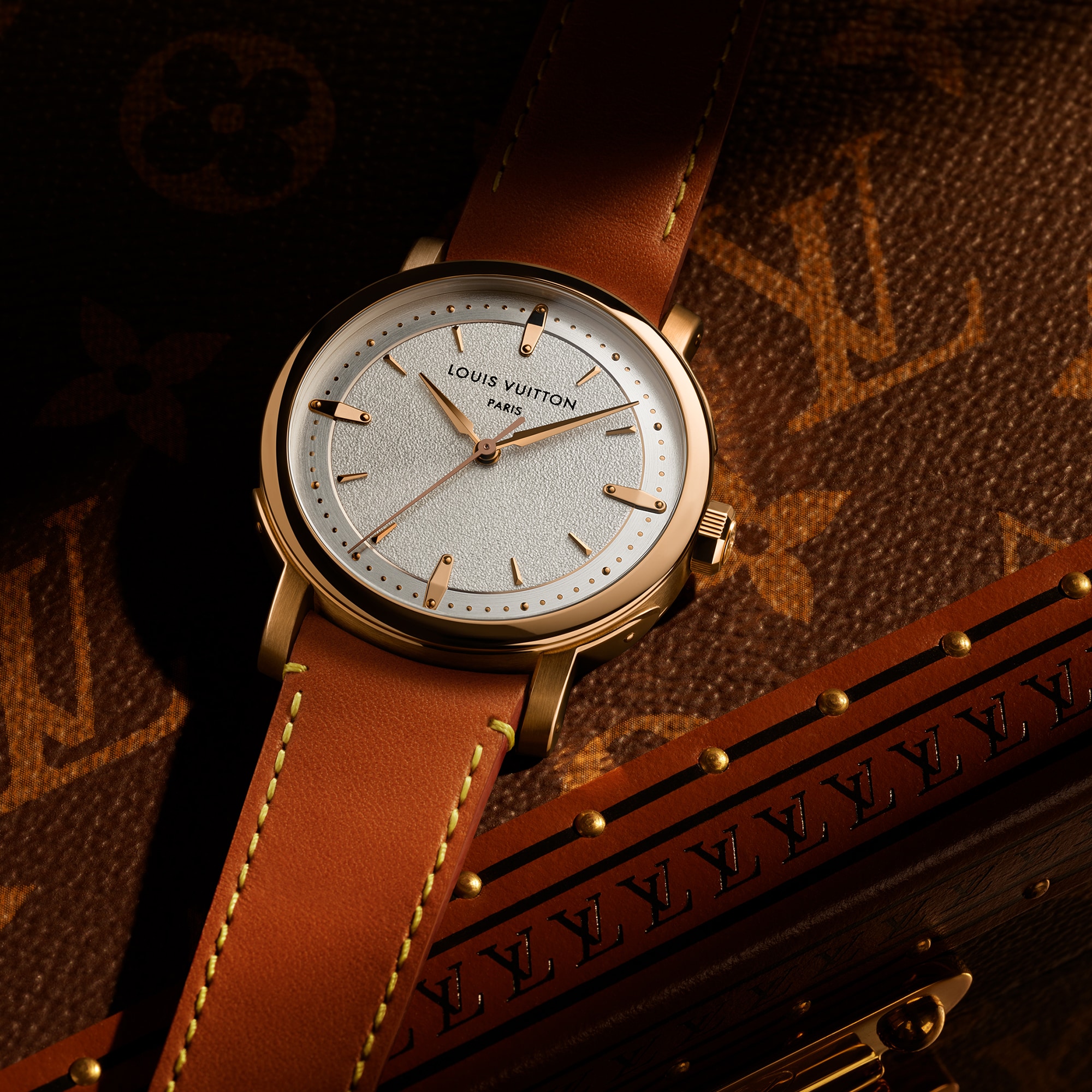 Jam tangan ini kaya akan kompleksitas, pada dial jam memperlihatkan indeks dan gold stud yang terinspirasi oleh aksen metalik dan lozine nail pada trunk ikonik dari Louis Vuitton, sementara ukiran pada bagian sentral menambahkan tekstur visual kepada pilihan variasi rose gold – yang merupakan sebuah ode kepada Monogram canvas ikonik milik Rumah Mode.