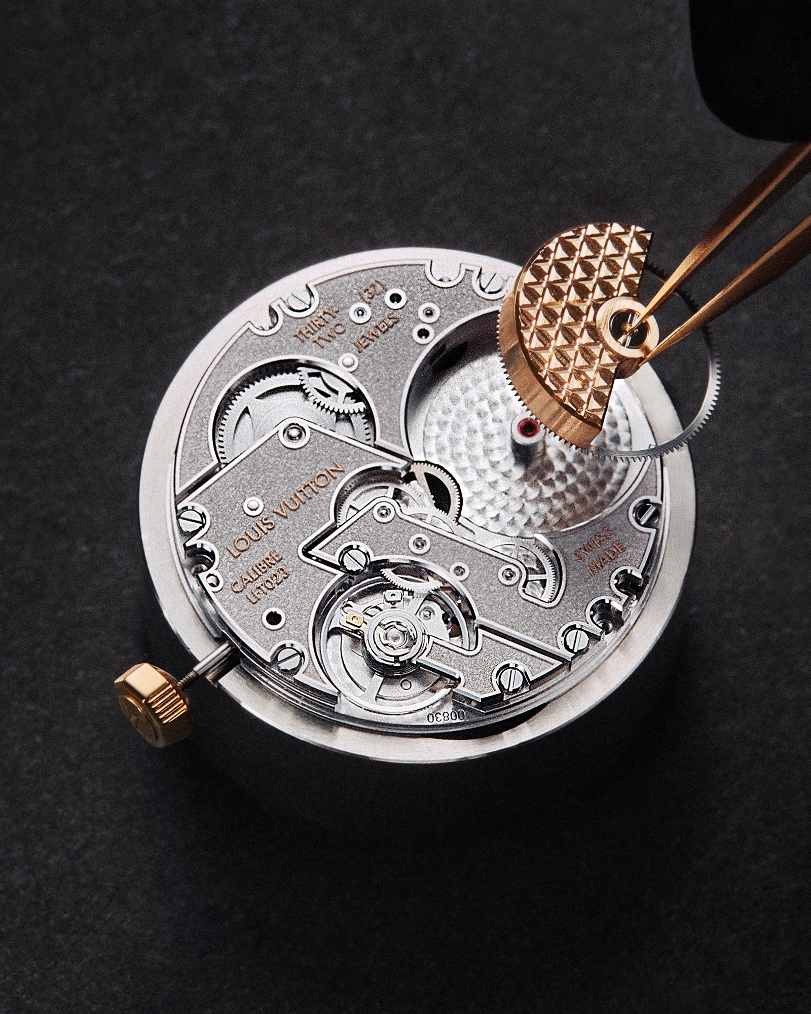 Louis Vuitton Escale dengan tenagai kaliber LFT023, dirancang oleh La Fabrique du Temps Louis Vuitton. Penggerak automatic three-hand movement eksklusif yang telah dipatenkan menjadi performa penunjuk waktu – dengan sertifikasi dari Observatorium Jenewa sebagai kronometer Swiss berpresisi tinggi.