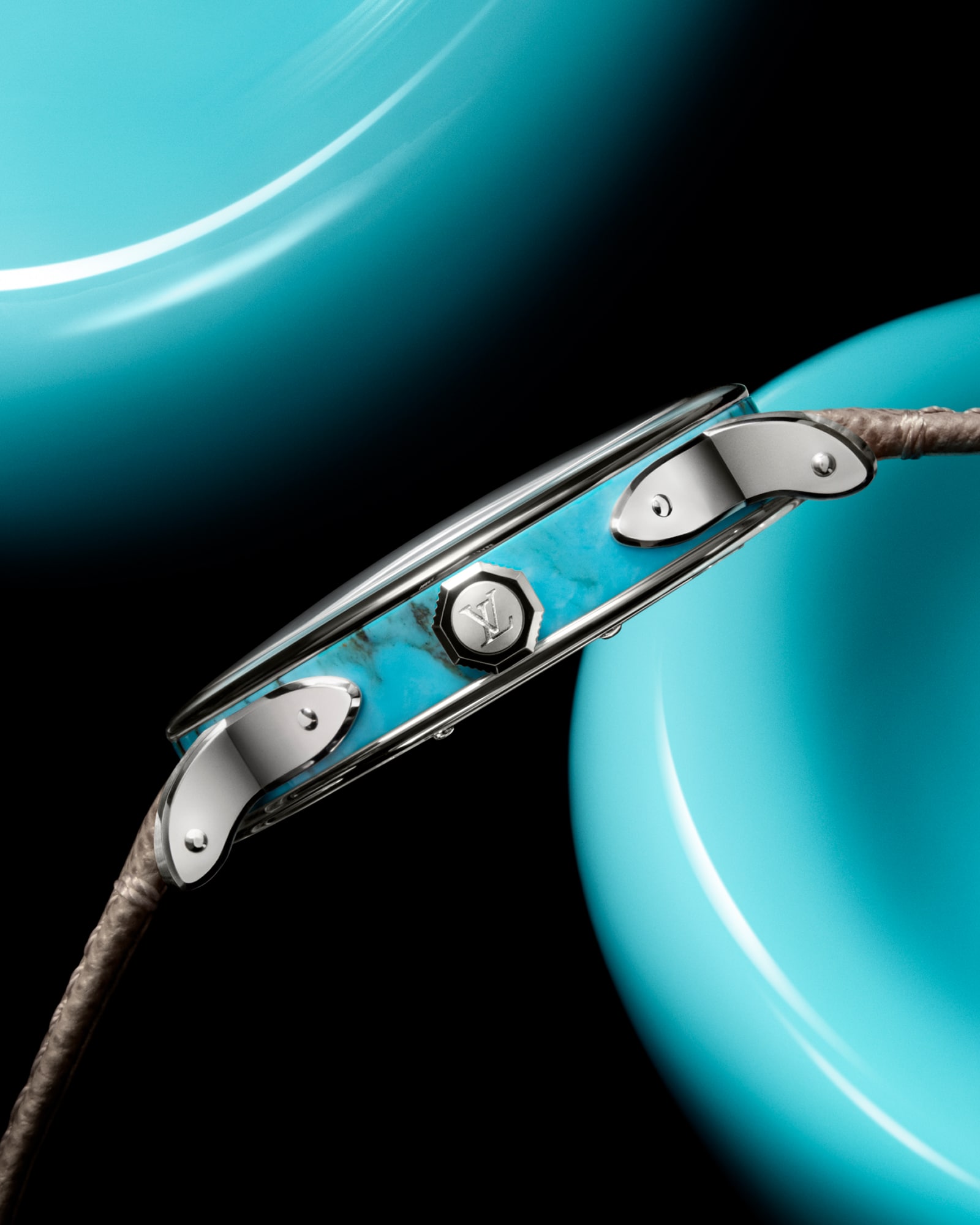 Louis Vuitton Escale Turquoise memadukan dial dan middle case dengan batu biru cerah, masing-masing dipotong dari satu urat batu tunggal dengan pola organik yang mendalam, menjadikan setiap bagiannya unik. Jam tangan berdiameter 40 mm ini mencerminkan keahlian teknis La Fabrique des Boîtiers, rumah produksi Louis Vuitton di Jenewa yang didedikasikan untuk kerampilan yang rumit dalam konstruksi casing nan canggih.
