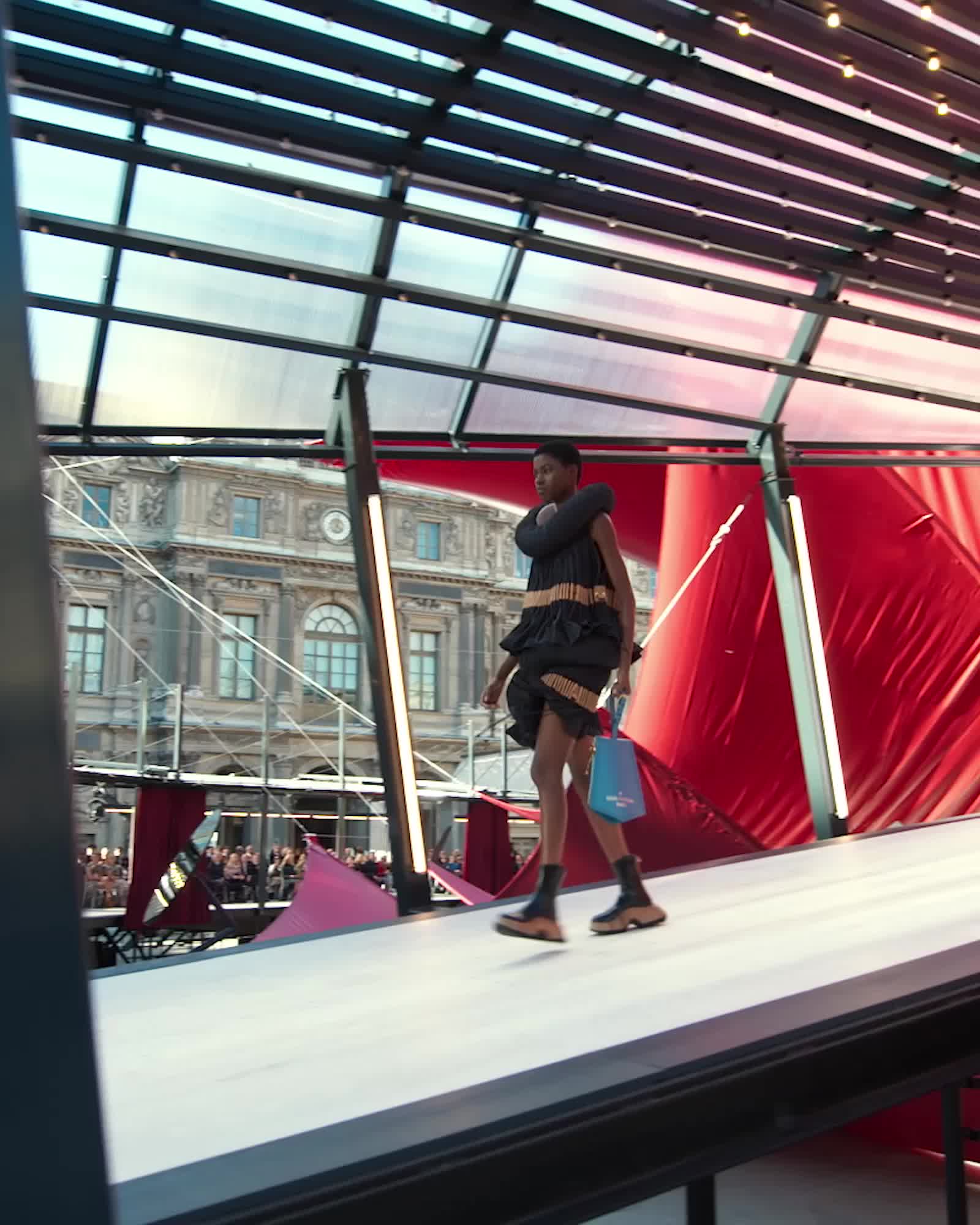 再度来到气势恢宏的巴黎卢浮宫,路易威登在方形中庭举办 2023 春夏女装秀。女装艺术总监 Nicolas Ghesquière 首度邀请当代法国顶尖艺术家 Philippe Parreno 与美术总监 James Chinlund,为本次活动构思令人惊叹的舞台布景概念。金属格栅、镜子与大量灯泡营造出露天游乐场般的奇妙观感,舞台中心的 “monster flower” 以鲜艳的红色花瓣衬托高耸于巴黎天空下的金色花蕊。