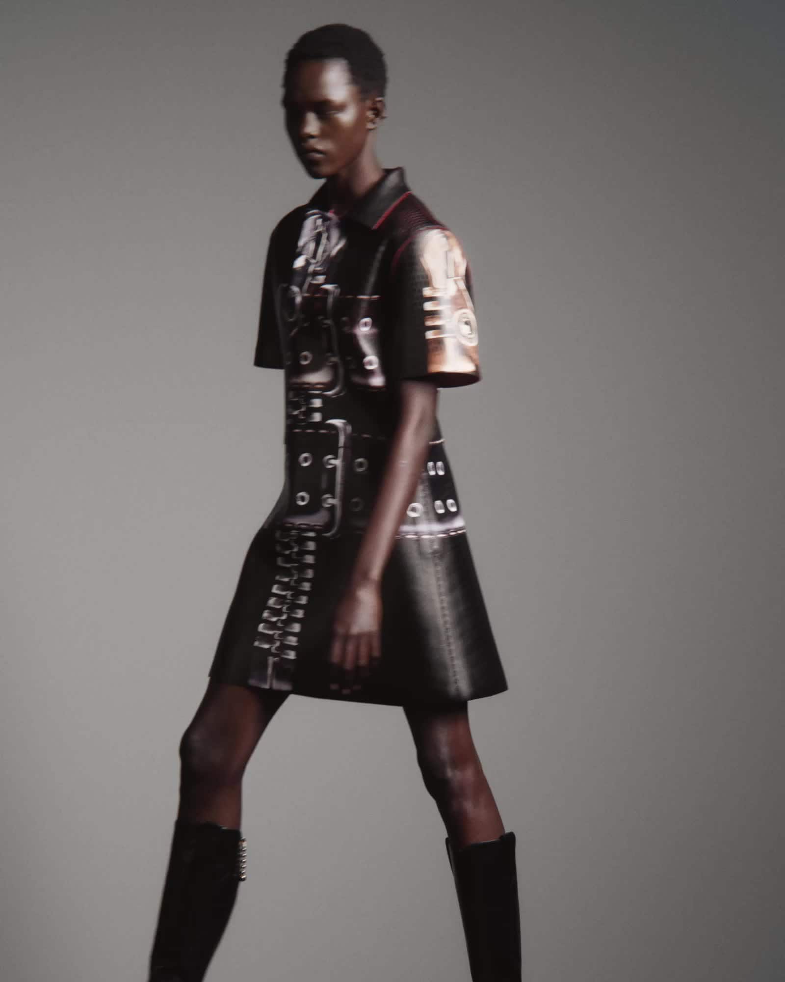 聚焦女性衣橱元素,重塑服装尺寸与比例,打造凸显细节的廓形。3D打印而成的腰带呈现错视效果,短裙褶皱经放大后,化身平褶连衣裙,释放独具一格的灵动意趣。此外,Nicolas Ghesquière采用刺绣工艺,模拟出大号花呢,并利用3D扫描仪,将每张图片放大,凸显每根织线及其纹理。在风格技法上凸显重点,一系列手袋或呈现比例失谐的细节,或以瞩目比例焕新演绎。
