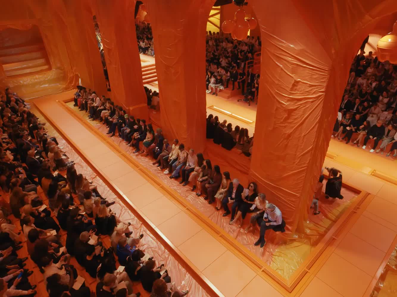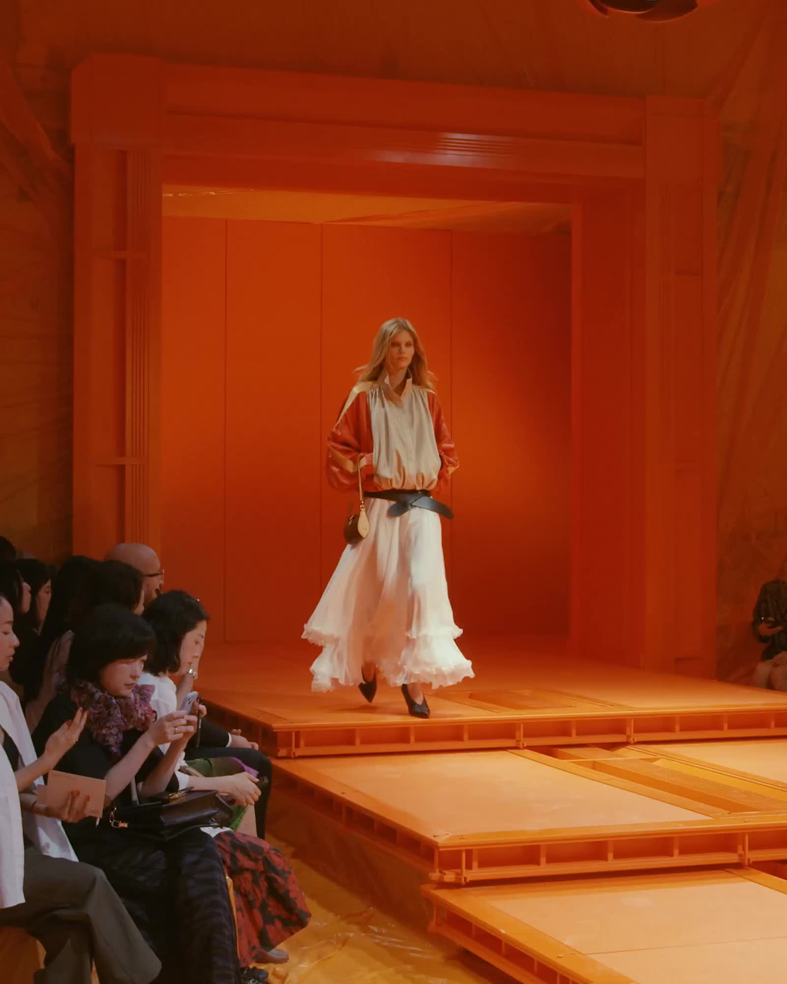 彰显旅行精神的热气球降落于香榭丽舍大道 103 号,令 James Chinlund 精心设计的场景浸染温暖夏日色调。Penique 打造的装置采用可回收和可循环利用材料,自墙壁垂坠而下,散发浓厚艺术气息。时间在这一刻仿佛静止,法国艺术家 Zaho de Sagazan 扮演旁白讲述者的身份,她独特的嗓音在整个秀场回荡。