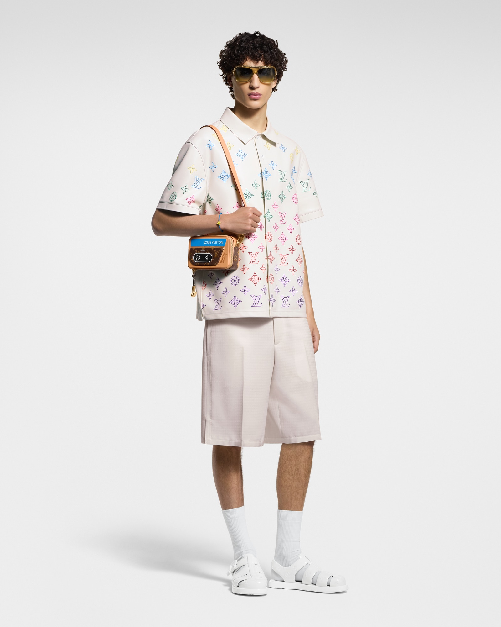 Baladeur Wearable Wallet 手袋结合牛皮革与 Monogram 涂层帆布,拥有横向开合、顶部粗犷按钮和正面透明小窗等细节,讲述初代卡式录音机的复古灵感。拉链头点缀 Pharrell Williams 设计的耳机造型装饰,与传统头戴式耳机遥相呼应。