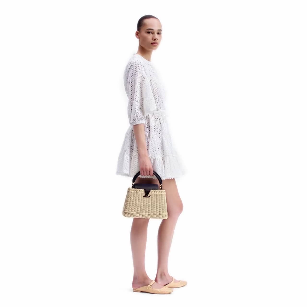 本款 Capucines BB 手袋回溯品牌于 1892 年推出的 Picnic 硬箱,以考究设计传递度假风情。藤条包身需要数天的匠心编织方可完成,充裕空间轻松容纳日常所需。翻盖可随心置于内外两侧,LV 字母和印花内衬再述品牌身份。