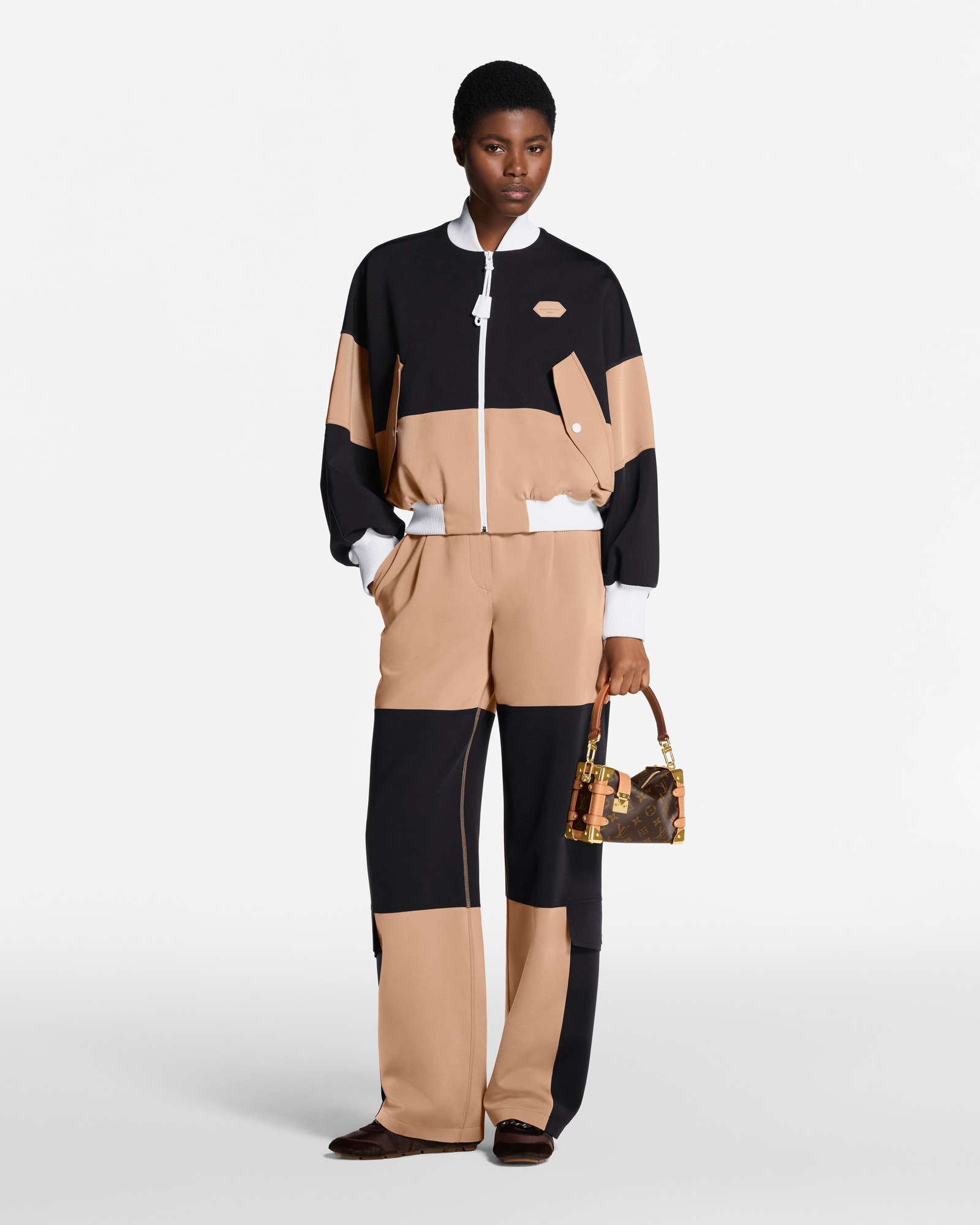 本款拉链飞行员夹克以科技针织构筑箱型廓形,演绎摩登运动风范。瞩目色块与撞色罗纹衣领、下摆和袖口相映成趣,宽大按扣口袋玩味比例玄机。路易威登巴黎贴饰含蓄标注胸前。