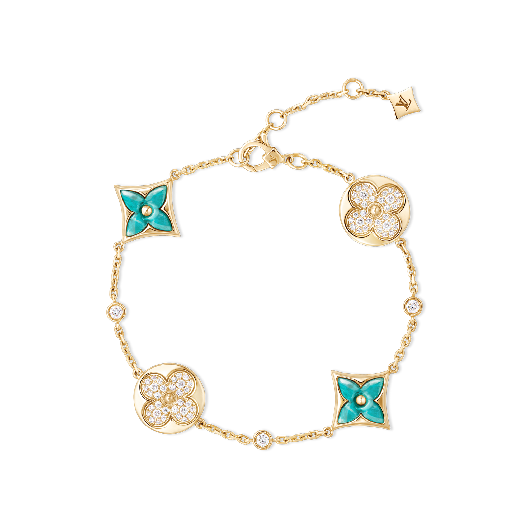 本款 Color Blossom BB Star 18K 金手链致敬 1896 年问世的经典 Monogram 元素。象征和平的天河石经抛光,点亮灿若明星的 Monogram 花卉,璀璨钻石再添熠熠华彩。