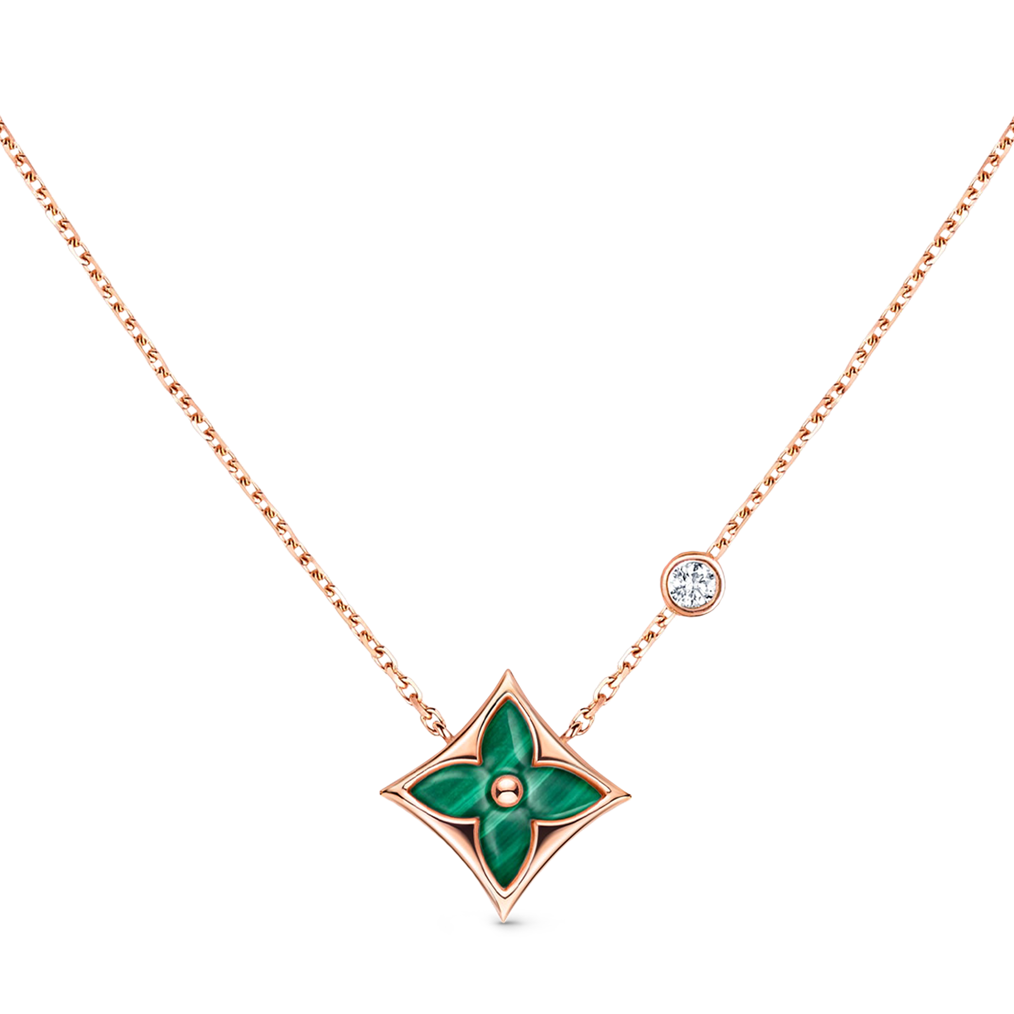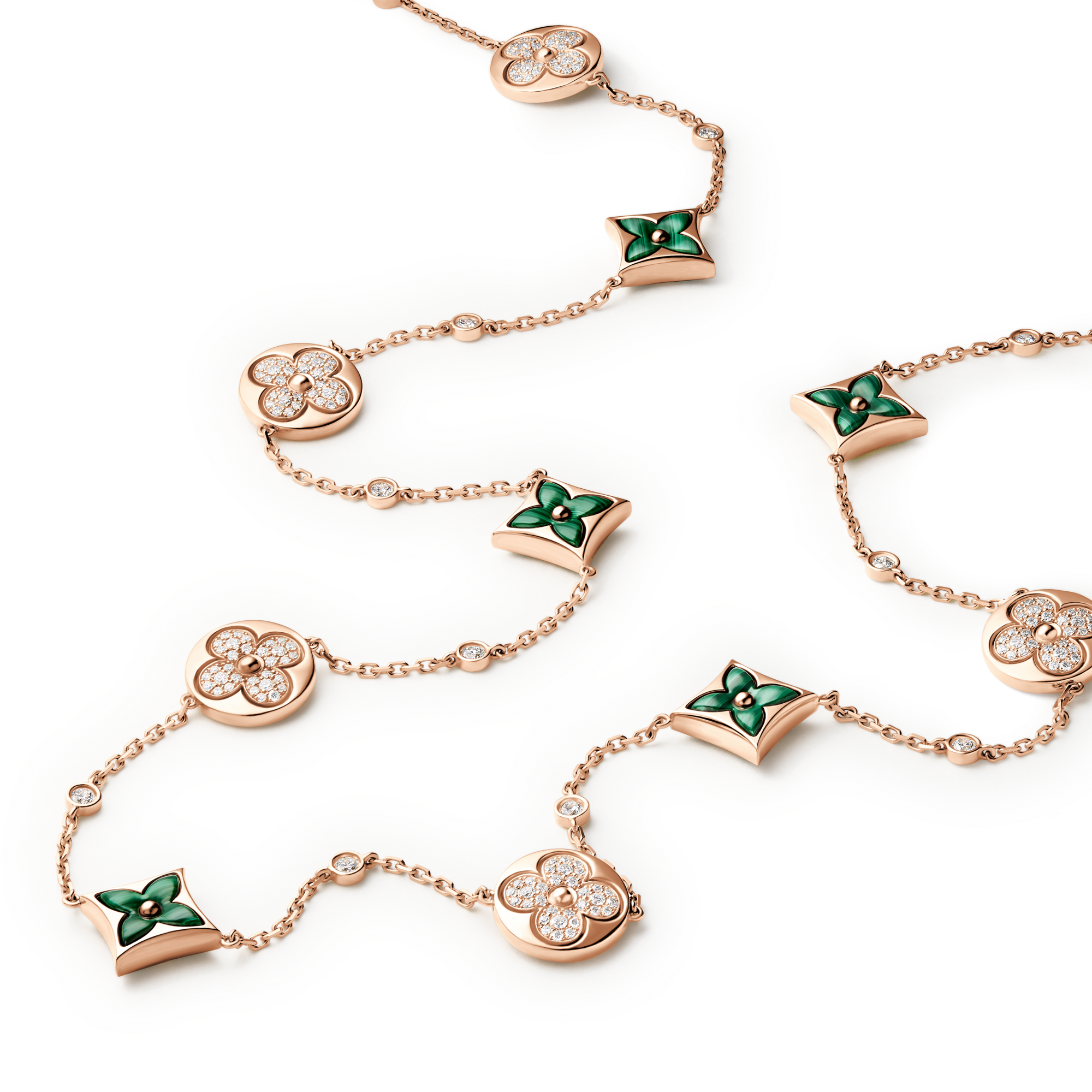Color Blossom M Sun 项链向 Georges Vuitton 于 1896 年创作的 Monogram 元素采撷灵感,以孔雀石雕琢圆润饱满的 Monogram 花卉,令其灿然绽放于 18K 金底座之上。抛光宝石赋予每件单品别样姿彩,与同系列其他珠宝搭配相宜。