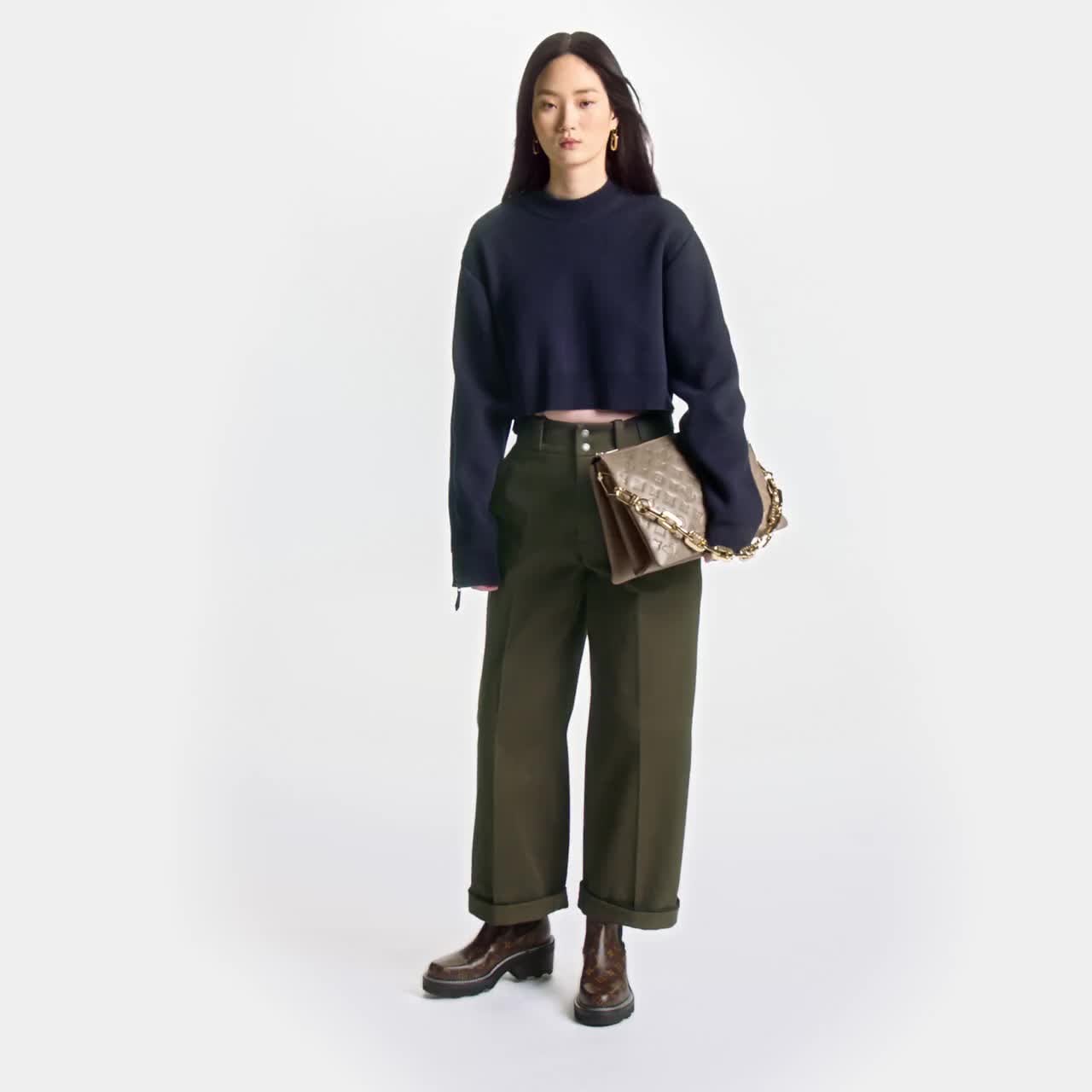 本款 Coussin 中号手袋源自 2021 秋冬系列,为蓬松羊皮革压印 Monogram 图案,以丰盈柔软质感营造靠枕般惬意体验。可调节织物肩带适宜肩背或斜挎,崭新 Edge 链条令其化身腋下包。