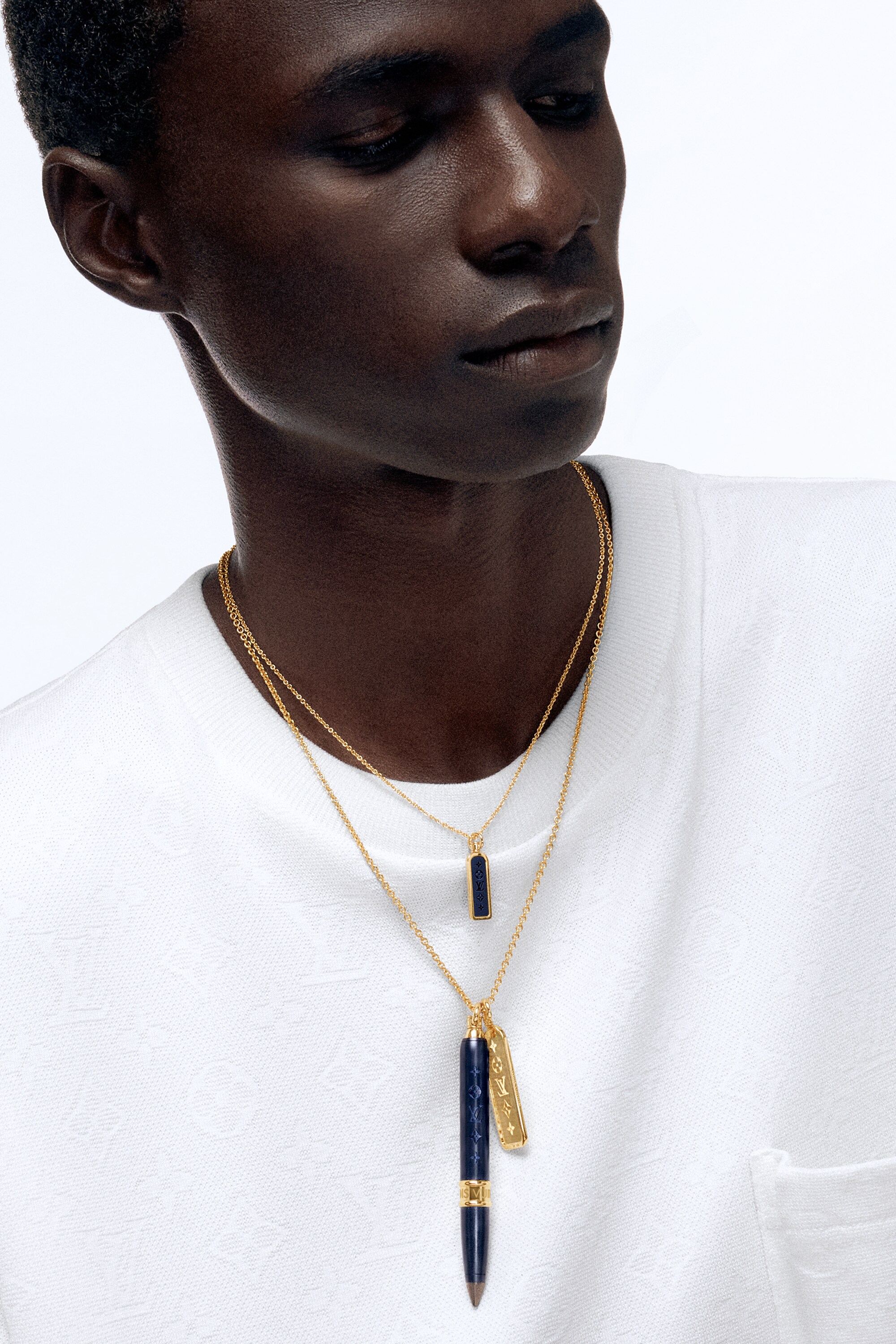Designer 项链出自 Les Gastons Vuitton 系列,以 18K 金和崭新钛金属淬炼可拆卸铅笔,致意 Gaston-Louis Vuitton 身兼收藏家、设计师和时尚绅士的多重身份。自丹宁面料汲取灵感的深邃色调和细腻 Monogram 铭纹共同彰显别致细节,再度挥洒 Gaston 的创意笔触。