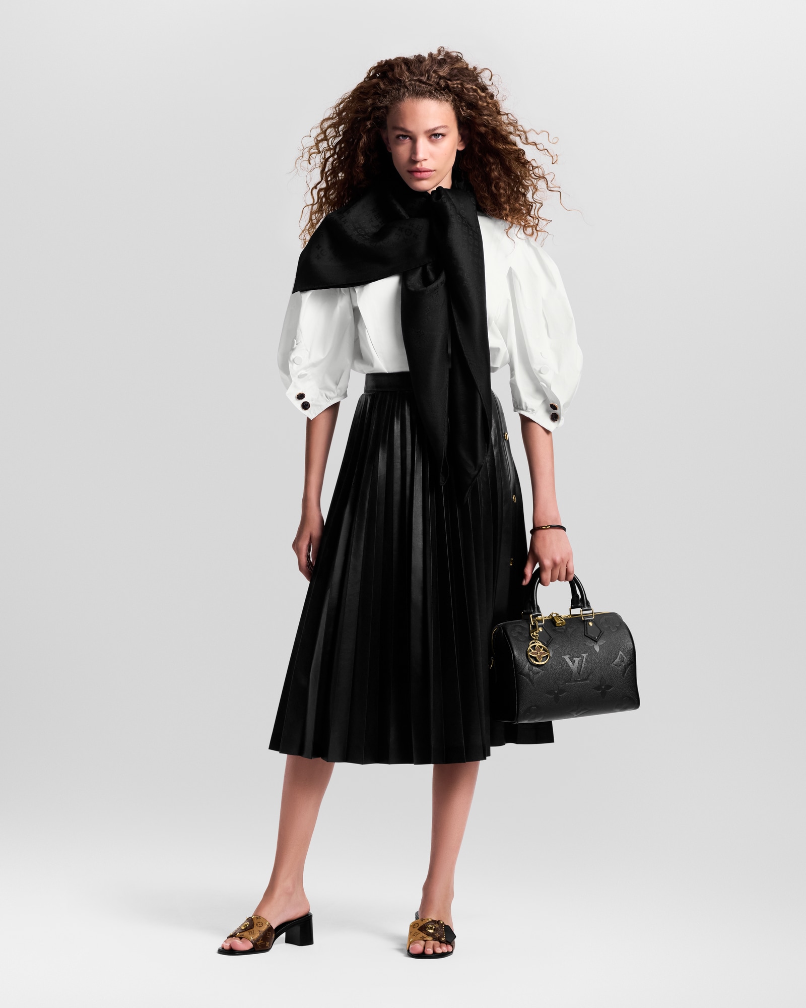 Evermore 披肩以提花工艺织就经典 Monogram 图案,搭配手工卷边。小幅剪裁方便系结。