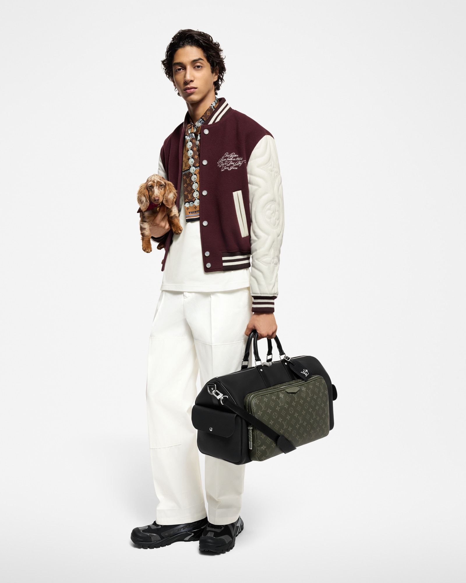 本款 Keepall Bandoulière 50 旅行袋出自 LV Park 系列,为粒面皮革包身巧妙融入 Monogram 涂层帆布拉链侧袋。可拆卸 LV Lovers 绒面名牌印证品牌身份。