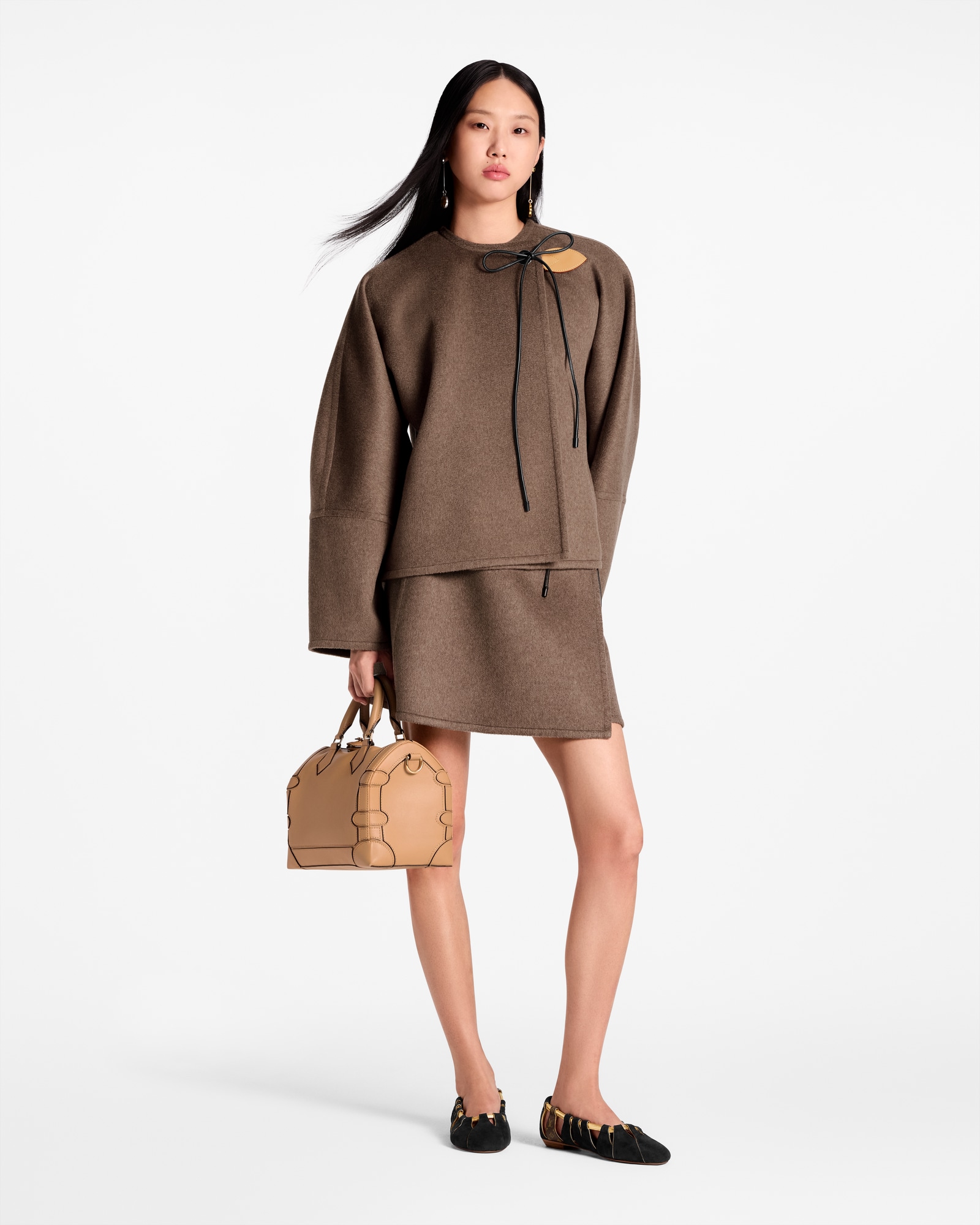 本款摩登夹克为双面山羊绒衣身浸染优雅应季色调。简约直身廓形与丰盈灯笼袖构筑视觉平衡,明线再添挺括观感。正面不对称系带搭配皮革袢带,含蓄流露品牌格调。