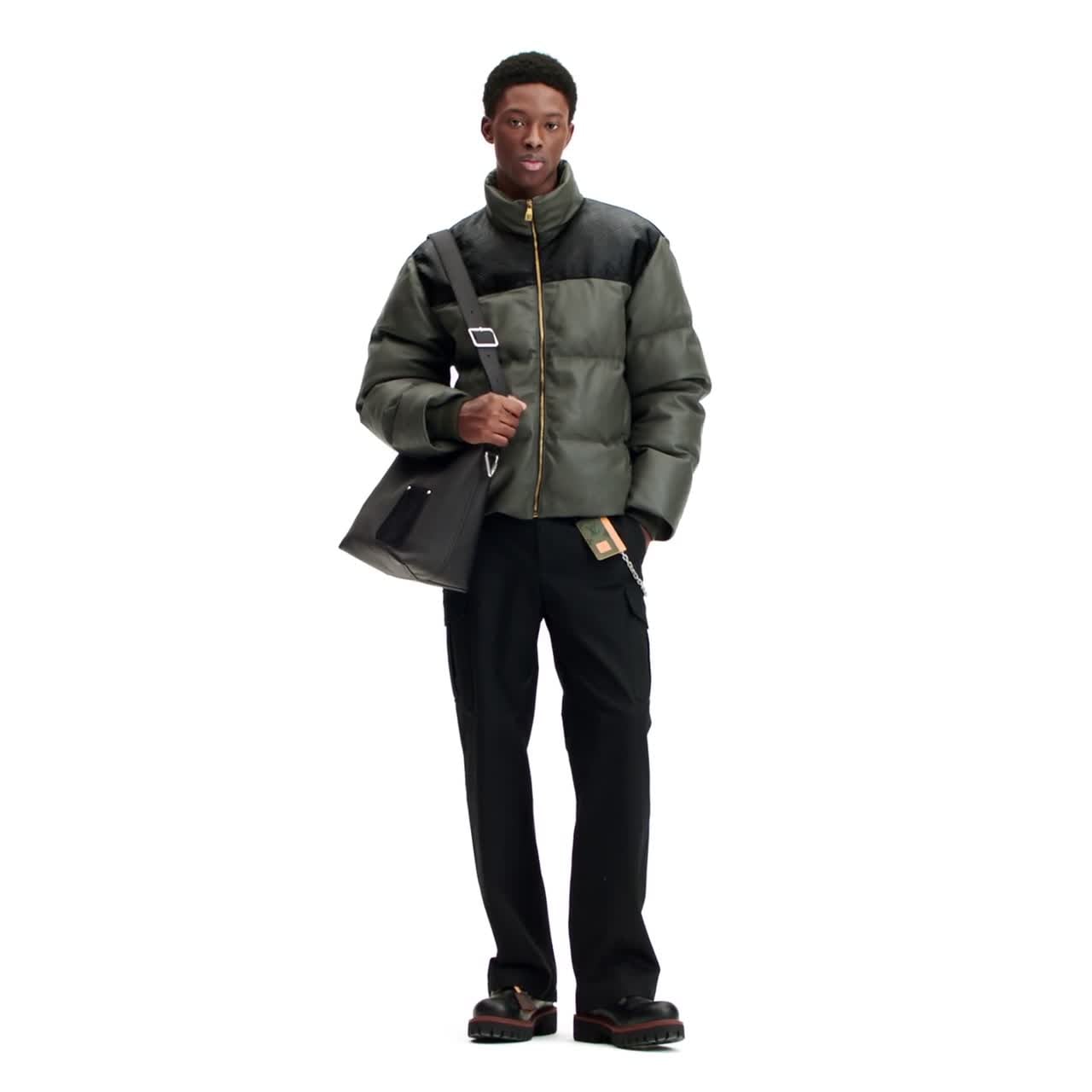 这款奢华的夹克,外层采用柔软羊皮革,填充轻暖 Ecodown©。光滑衣身和衣袖与粒面皮革抵肩形成对比。抵肩上饰有压纹 Monogram 图案。立领与针织罗纹袖口可确保领口与腕部温暖,隐藏式抽绳腰部进一步抵御严寒。