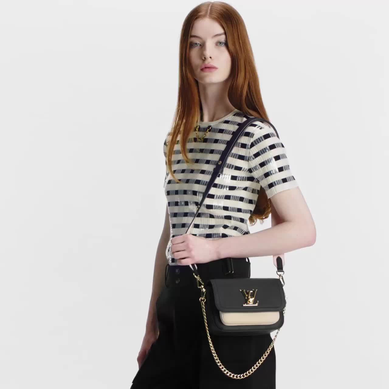 Lockme Tender 手袋取材柔软粒面牛皮革,其金属 D 形环可悬挂个性配饰。可拆卸并调节的宽幅肩带在传统链条之外增添实用细节。