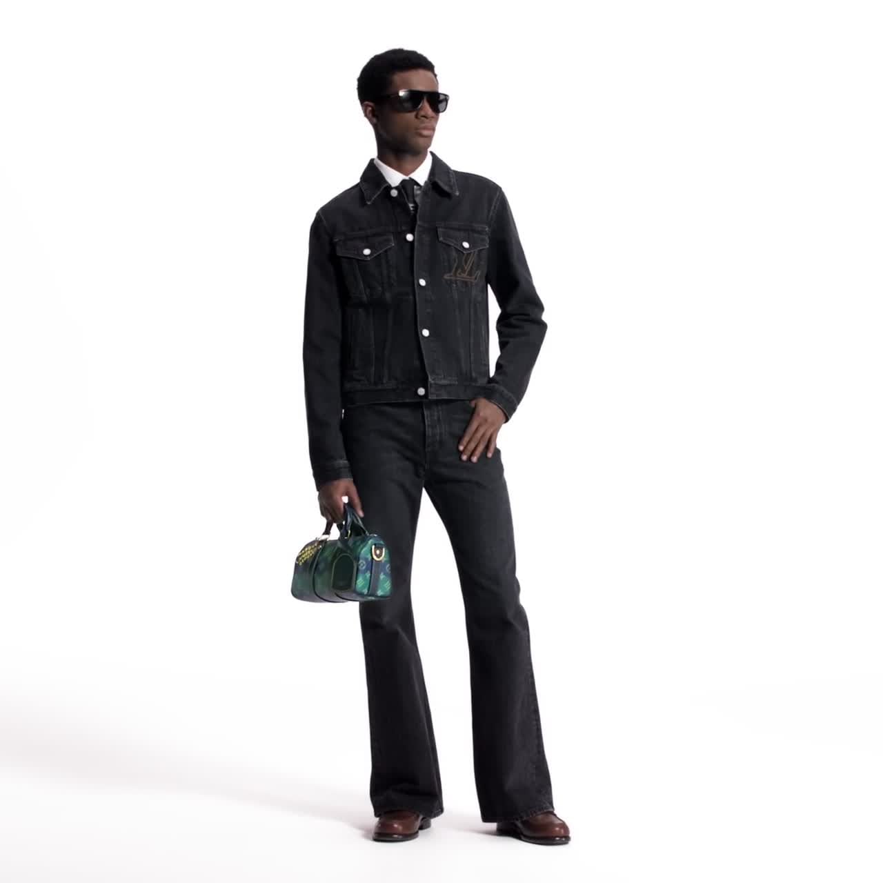本款卡车夹克选用日本砂洗丹宁布,于胸袋之上刺绣明线 LV 字母,再为后部正绒面革 Damier 标签压印 LV 标识,匠心展现路易威登精湛工艺。珠光纽扣点亮日常之选。
