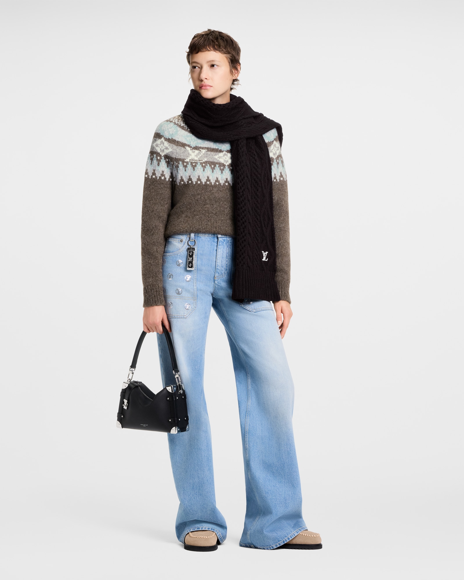 LV Holiday 围巾以柔软绵羊毛塑造宽松针织设计,令闲雅格调与功能考量兼收并蓄,成就冬日度假和雪后休憩时光的潮流之选。LV 字母含蓄点明品牌身份。