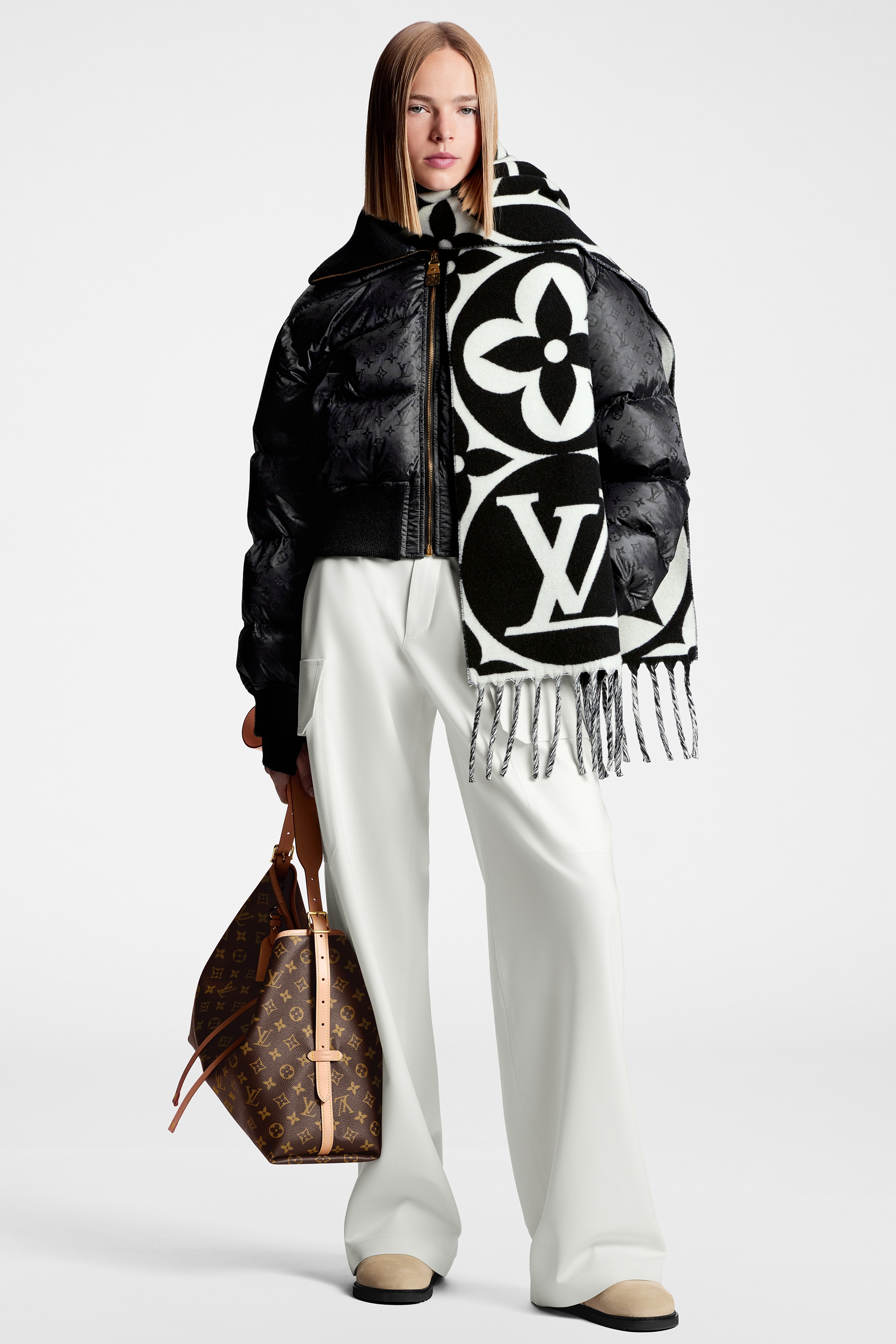 LV Medallion 围巾以大号 LV 字母和 Monogram 花卉彰显品牌格调,再以纤长流苏饰边增添华美质感。绵羊毛围裹舒适暖意,无惧隆冬时节的寒风侵袭。