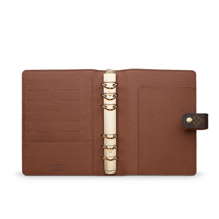这款记事本封皮设有按扭开合、六个信用卡夹层和两个隔层。