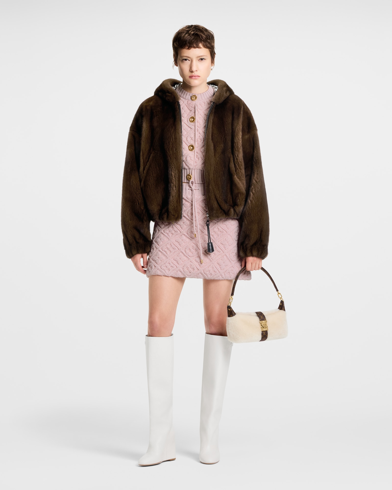 本款 A 字迷你裙以蓬松毛绒混纺毛巾布塑造休闲构型,全幅经典 Monogram 图案呈现浮雕般的立体观感,与宽幅罗纹腰部构筑纹理反差。点缀莹泽端头的抽绳可调节贴合度。