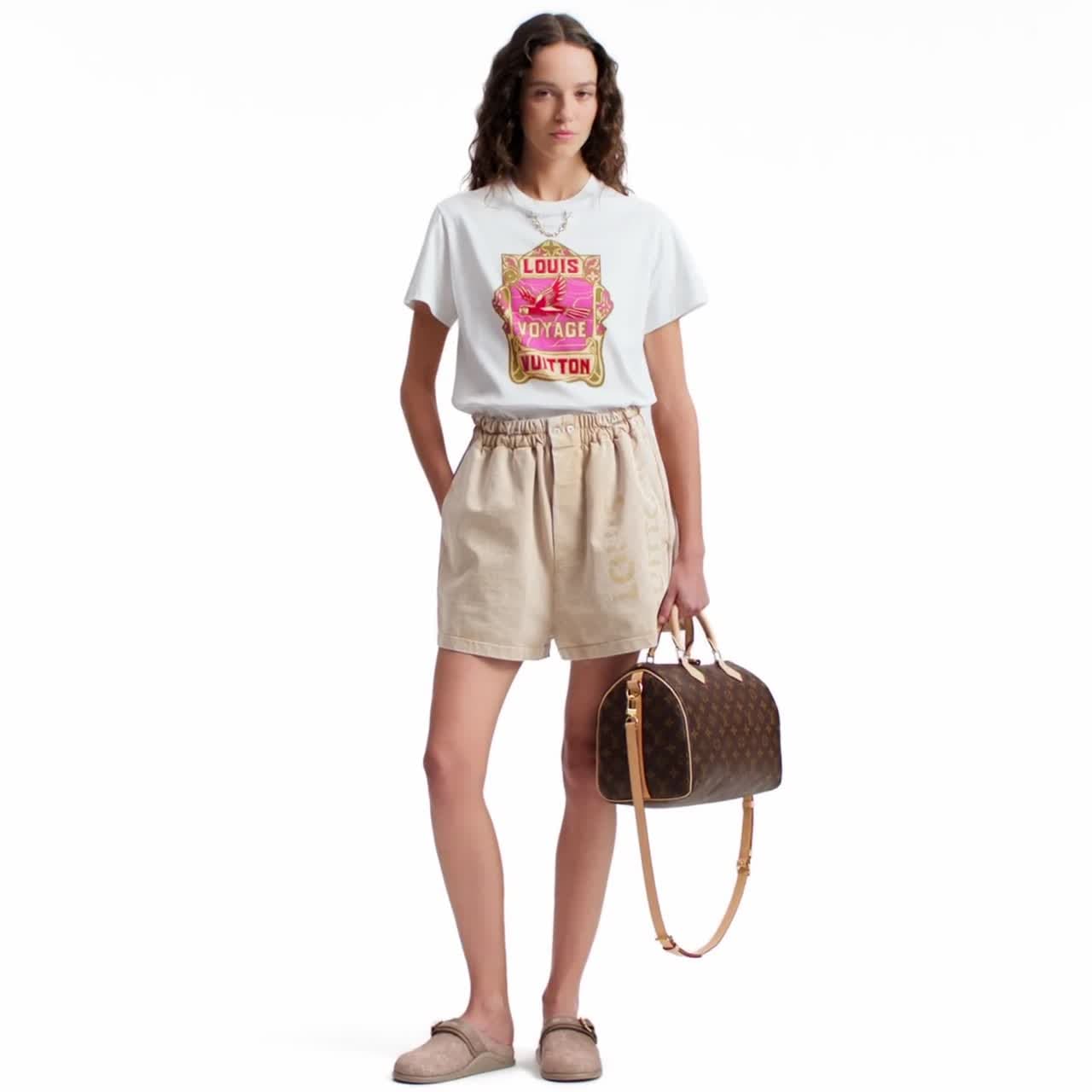 本款 T 恤以绚烂色彩描绘胸前印花,令路易威登标识与鹦鹉图案跃现其间,仿若一枚复古旅行印章。柔软棉质针织裁出休闲廓形,LV 链条完善领口设计。