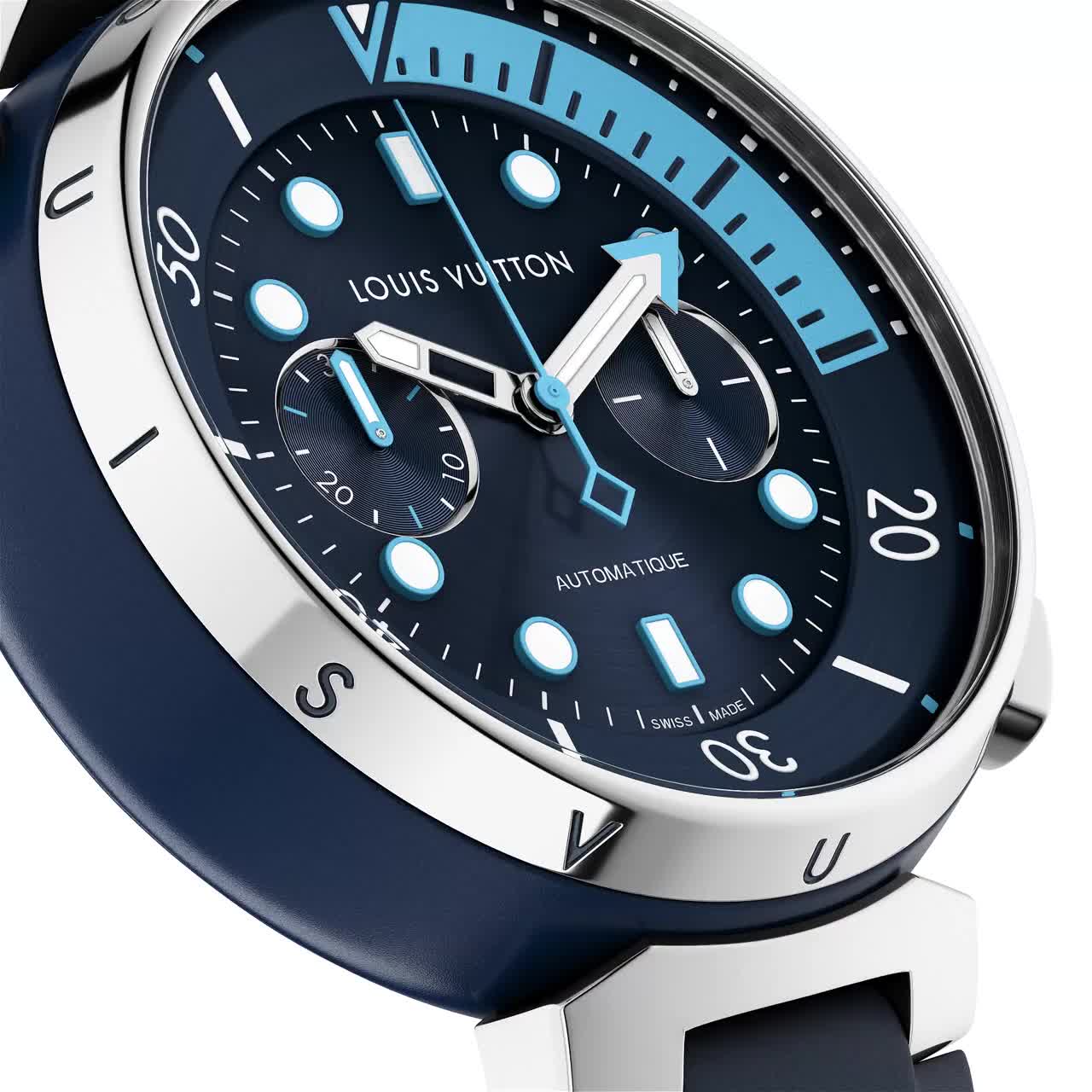 Tambour Street Diver Skyline Blue Chronograph 计时腕表为 Street Diver 腕表系列再添沉稳一笔。精密计时讲述路易威登对功能设计和清晰读时的一贯追求,重现 2021 日内瓦高级钟表大赏获奖作品的美学元素。宽大 Tambour 表壳搭配荧光指针,可为任意造型注入运动风尚和航海精神。