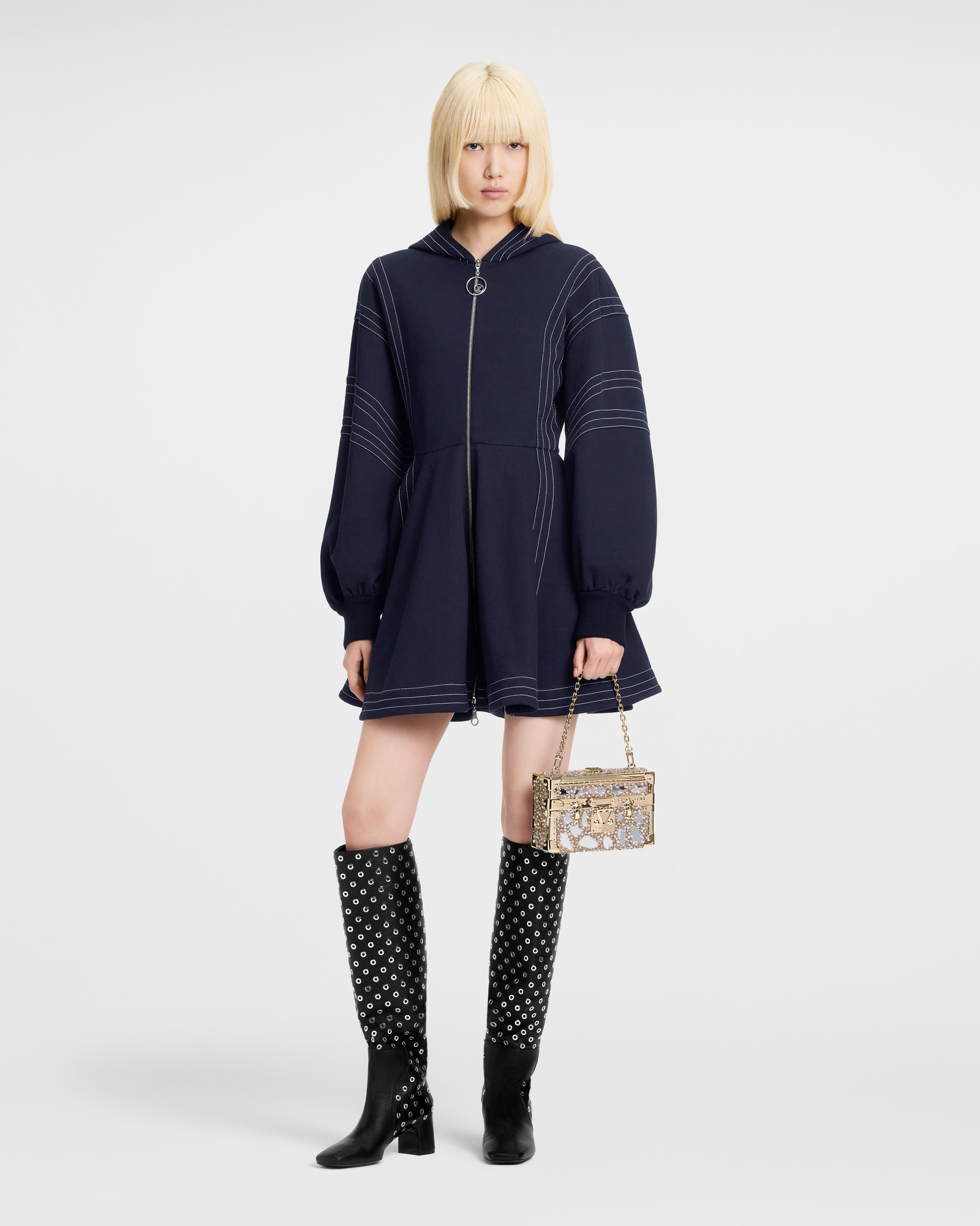 本款秀场系列连衣裙向富有表现力的中世纪廓形汲取灵感,令经典与摩登元素交融碰撞。丰盈棉绒针织混纺裁成闲适构型,撞色明线条纹增添考究细节。灯笼袖与喇叭下摆流露浪漫气息,宽大兜帽与双头拉链前襟传递运动风尚。