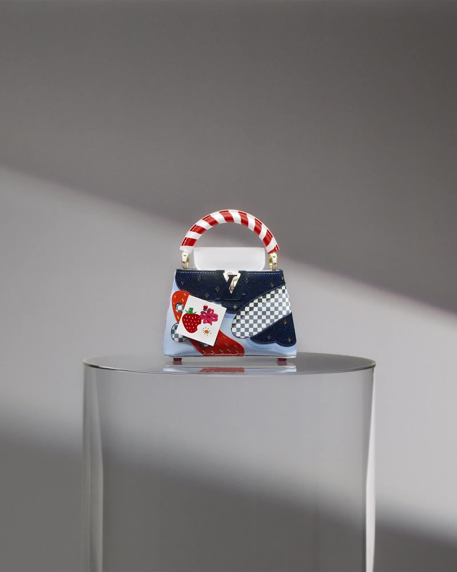 王子平设计的迷你 Capucines 手袋是品牌迄今为止尺寸最小的 Artycapucines 手袋,以万花筒般的视角焕新诠释路易威登经典元素,结合灵感源自经典 Damier 格纹的几何图案和彩色装饰。新款手袋充满奇思妙想,令人想起糖果包装纸和甜点。