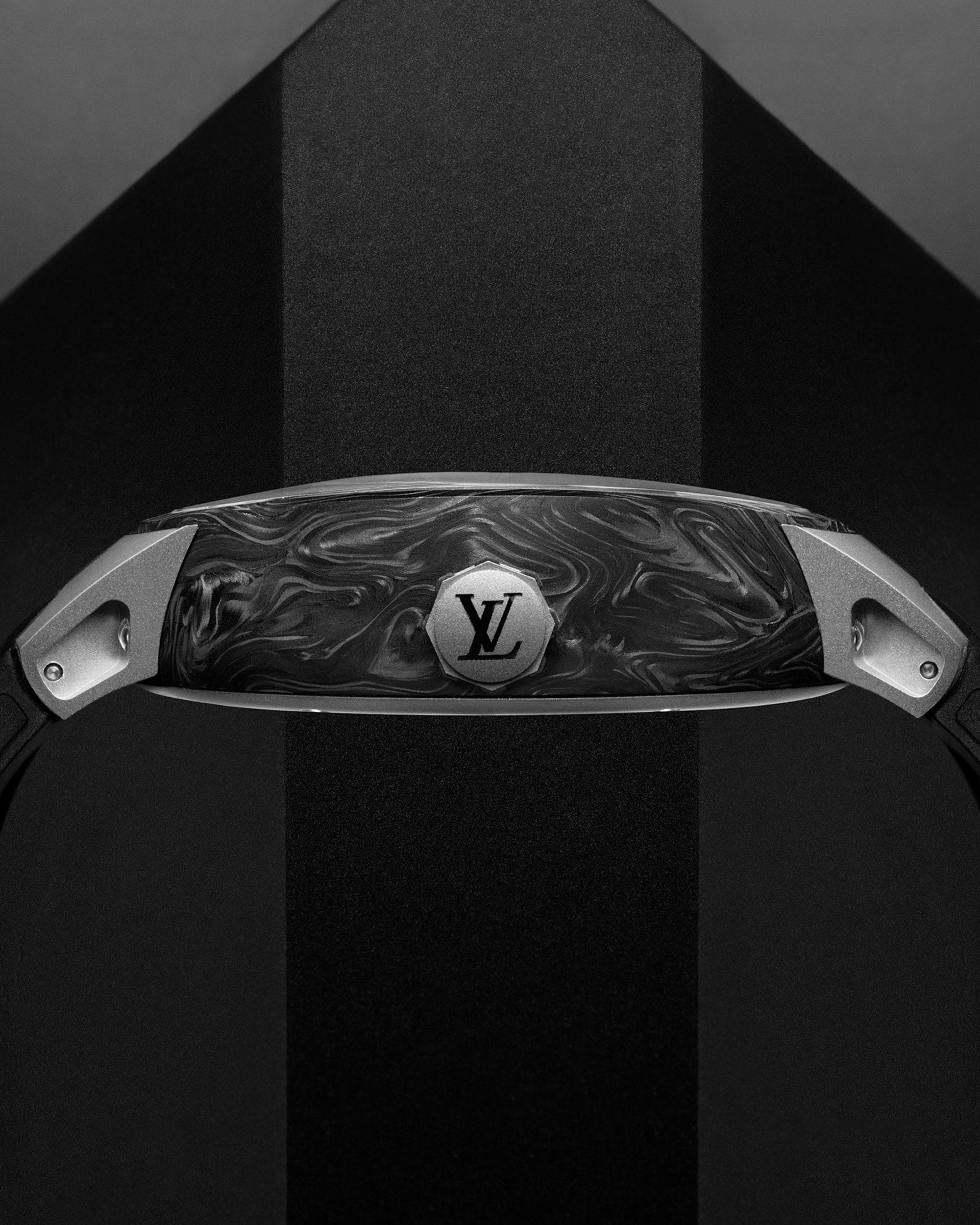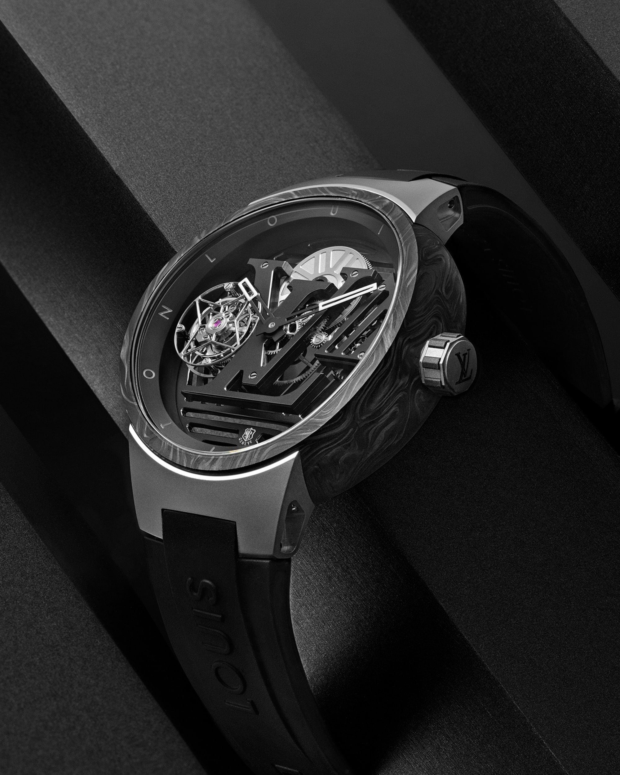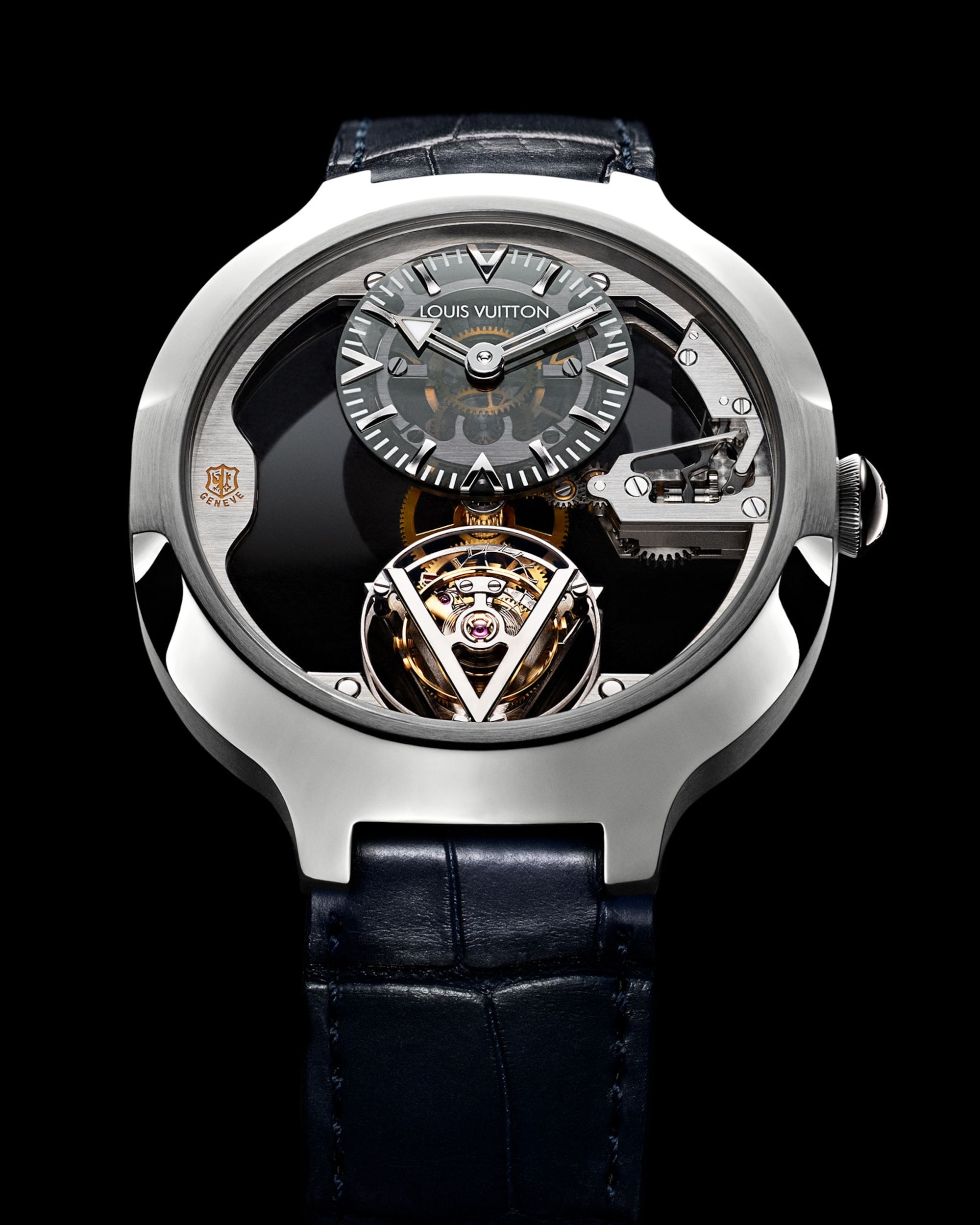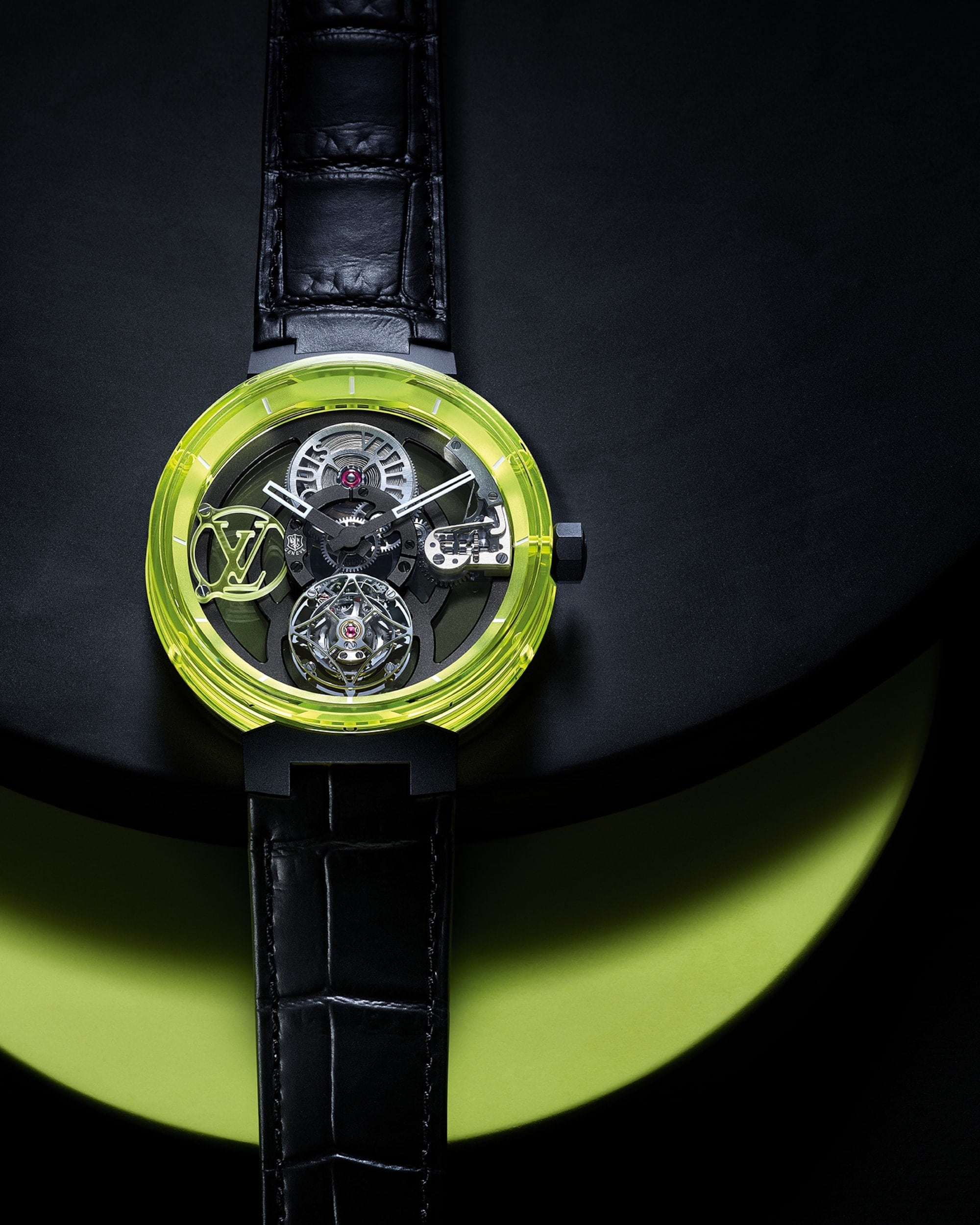 Tambour Curve Flying Tourbillon Poinçon de Genève 系列腕表与传统 Tambour 系列腕表相比, 更具未来感和技术感。本款腕表设计轻盈, 采用开放式结构, 由飞行陀飞轮擒纵机构驱动, 堪称新一代极具阳刚气质的前卫腕表。