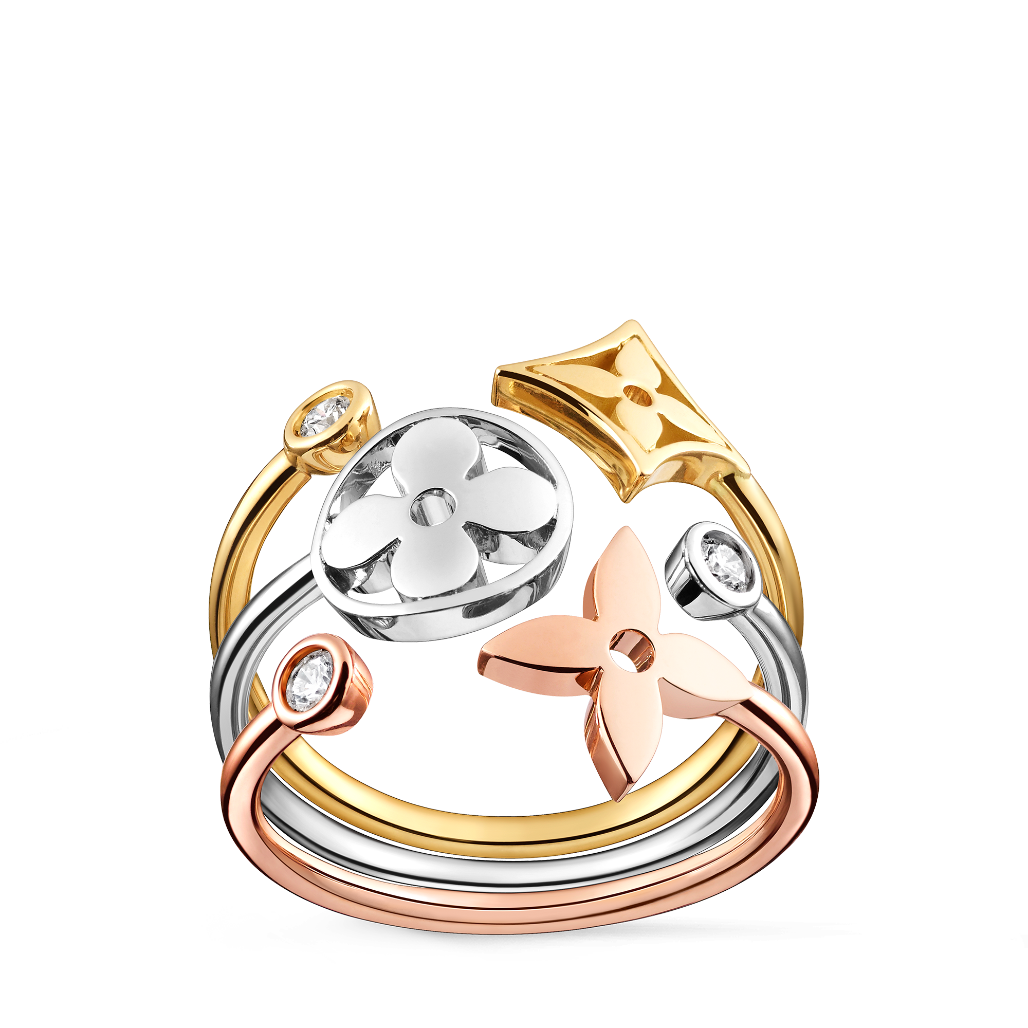 路易威登 Idylle Blossom 系列单品采用玫瑰金、黄金和白色金材质,镶嵌耀眼钻石,呈现多种风格变幻。可单独佩戴,亦可叠戴,精致单品展现栩栩如生的路易威登经典标识。