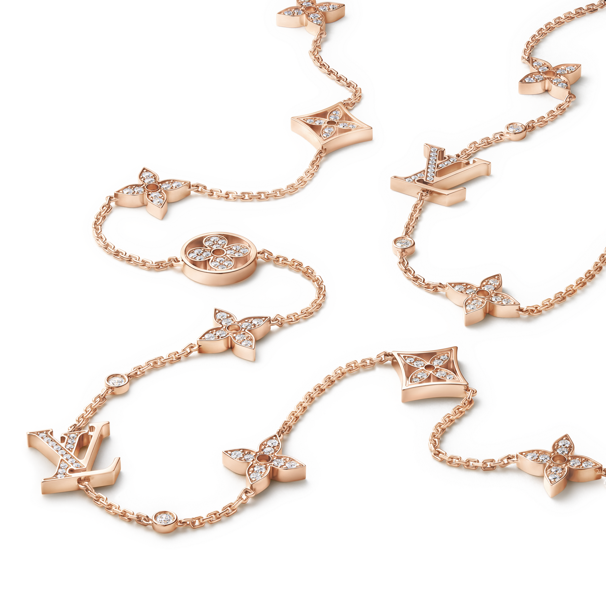 多款项链与吊坠以不同金材质造就,呈现不同长度,尽显灵动百搭风格,亦令路易威登经典图案的独特韵味在其中一一绽现。